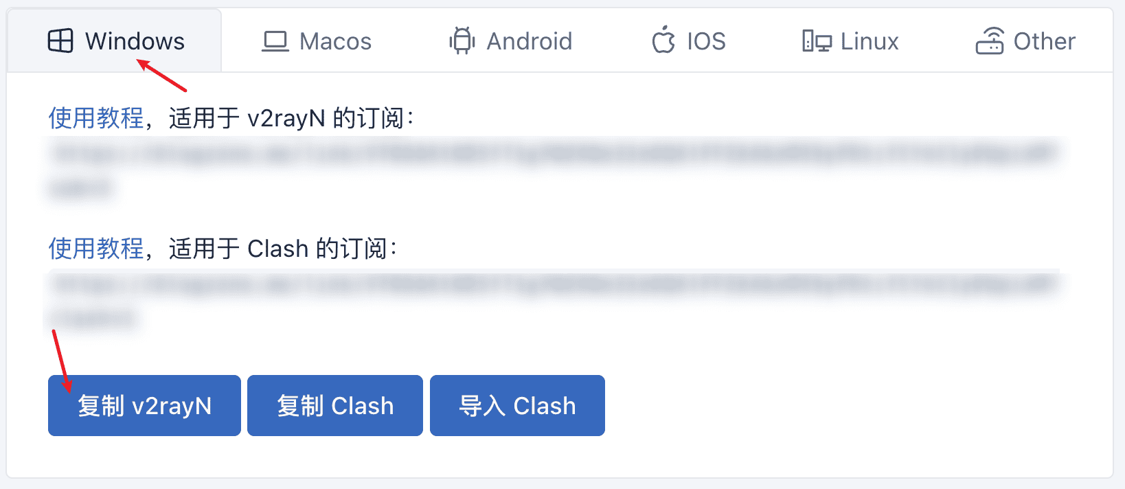 在用户中心首页,点击如图所示的标签页和按钮,复制订阅地址