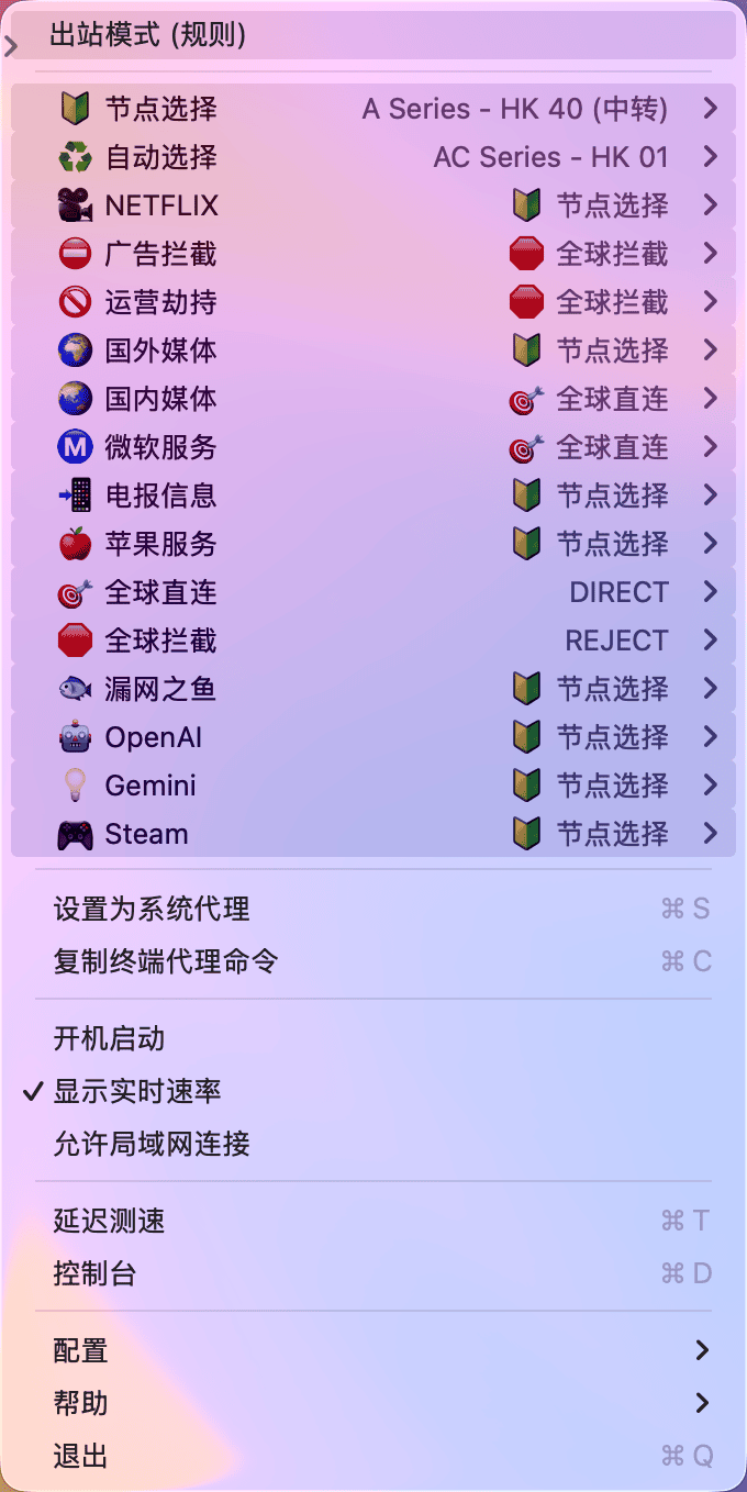 在 节点选择 选项卡中选择节点,然后勾选 设置为系统代理